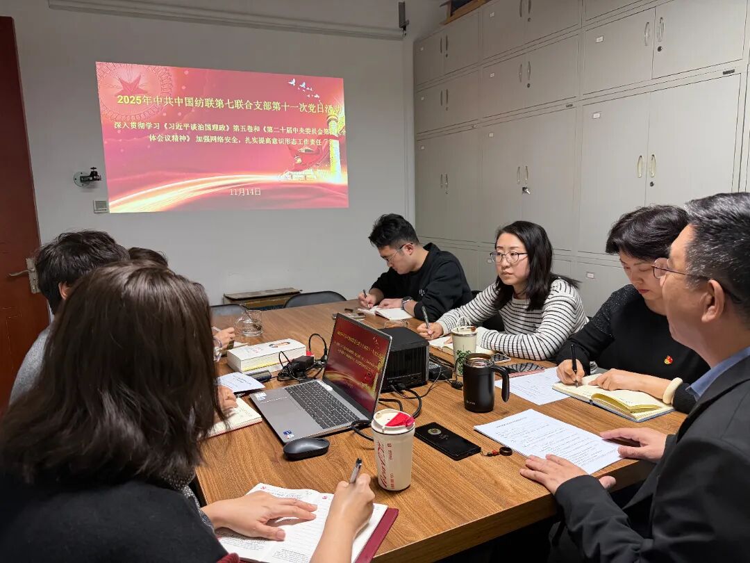 11月14日下午,中国纺联第七联合党支部召开第十一次党日活动。主要内容包括“书记讲党课”和集体学习《习近平谈治国理政(第五卷)》。活动由支部书记王加毅主持。