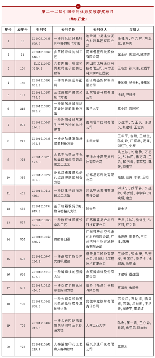 5月10日,国家知识产权局发布第二十二届中国专利奖评审结果公示。第二十二届中国专利奖共评选出中国专利金奖预获奖项目30项,中国外观设计金奖预获奖项目10项,中国专利银奖预获奖项目60项,中国外观设计银奖预获奖项目15项,中国专利优秀奖预获奖项目826项,中国外观设计优秀奖预获奖项目56项。公示期为2021年5月10日至5月14日。20项纺织专利位列第二十二届中国专利优秀奖预获奖项目中。