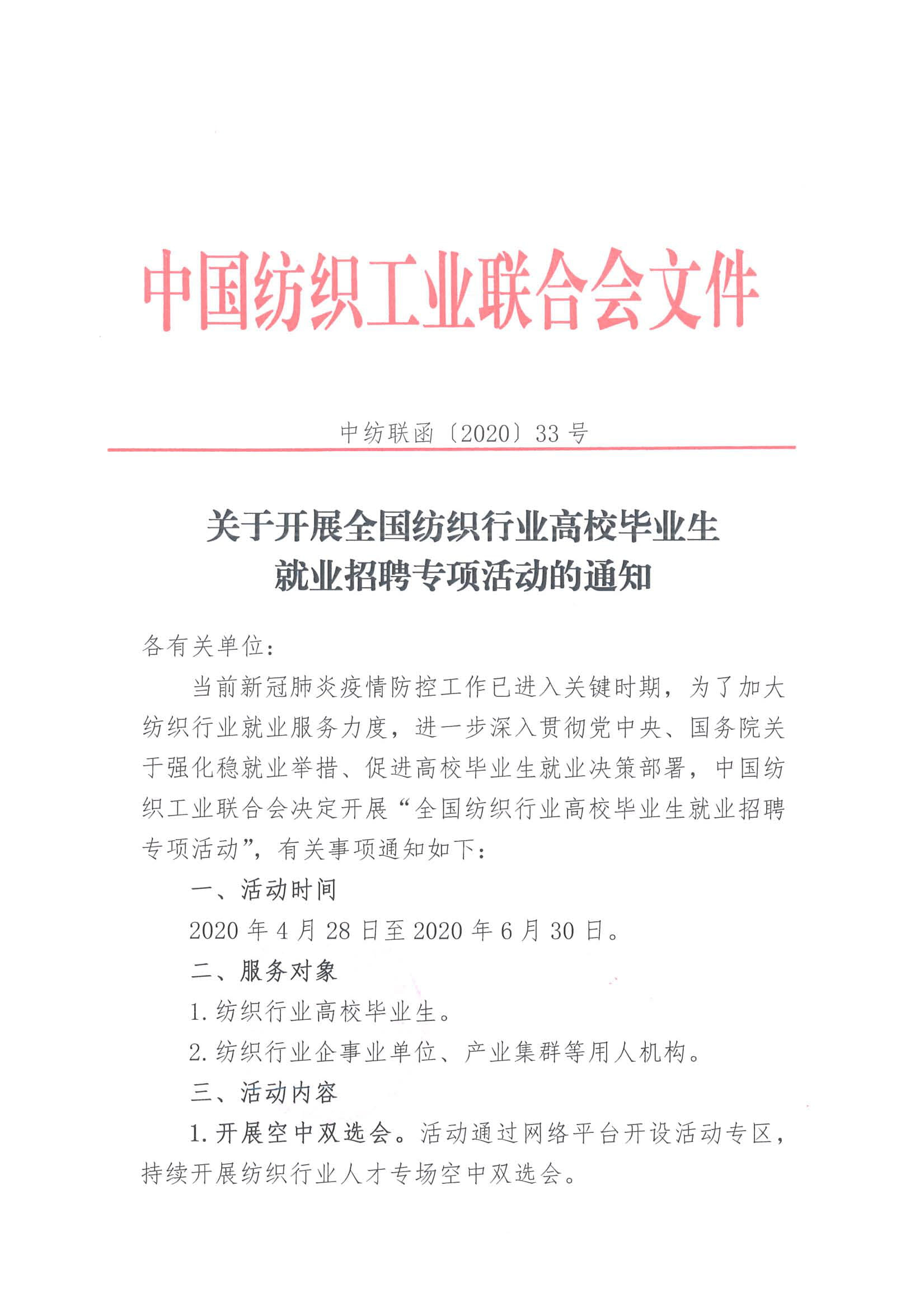 当前新冠肺炎疫情防控工作已进入关键时期,为了加大纺织行业就业服务力度,进一步深入贯彻党中央、国务院关于强化稳就业举措、促进高校毕业生就业决策部署,中国纺织工业联合会决定开展“全国纺织行业高校毕业生就业招聘专项活动”,中国长丝织造协会作为组织联络单位,特转发相关通知。如有意向参加,请与工作人员联系!
